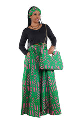 It is a long floating skirt with a traditional Kente print and comes with a handbag. Simply stylish because of the vibrant color pattern. The skirt has two convenient pockets and an elasticated waistband with attached belts. Comes with a matching head wrap. This skirt can be dressed up or down. Hand wash in cold water. Gentle dry cycle. CHSK03-1001