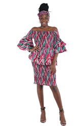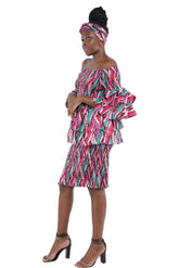 African Smocked Blouse & Skirt Set w/ Head Wrap | Ankara Dashiki Print Dress Attire, One Size